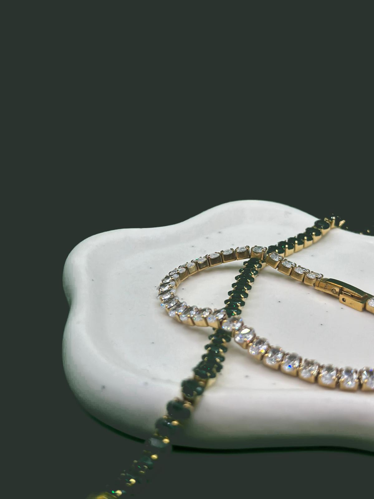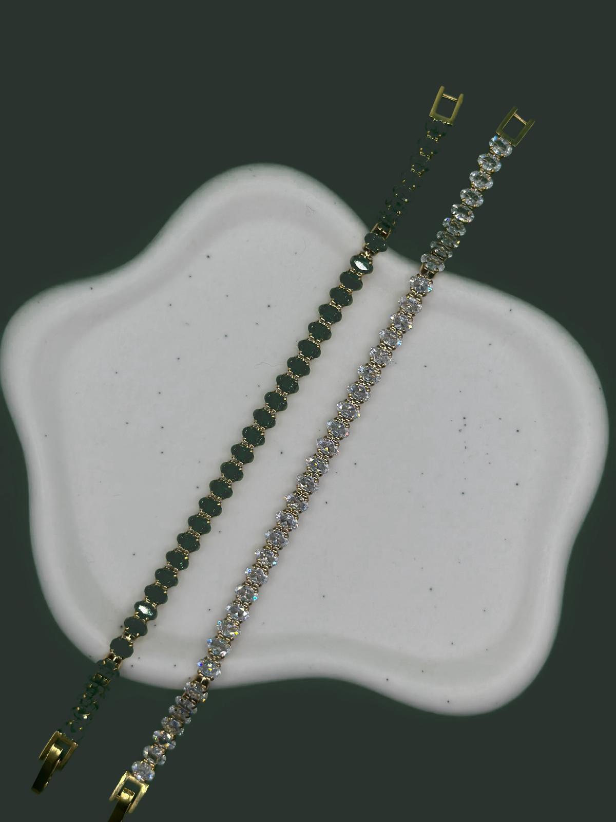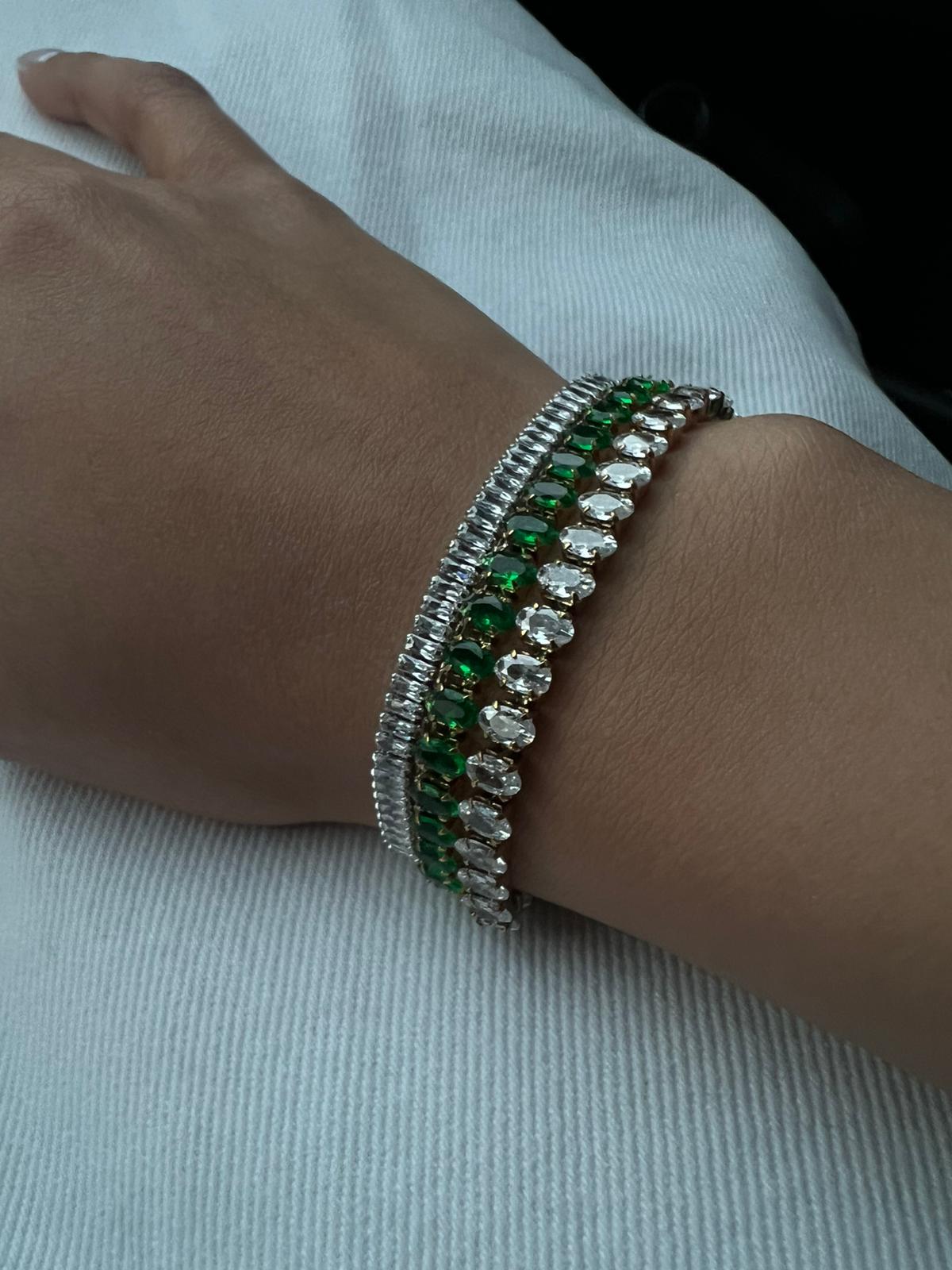 Radiant crystal bracelets featuring emerald-green and clear stones, made to stand out.